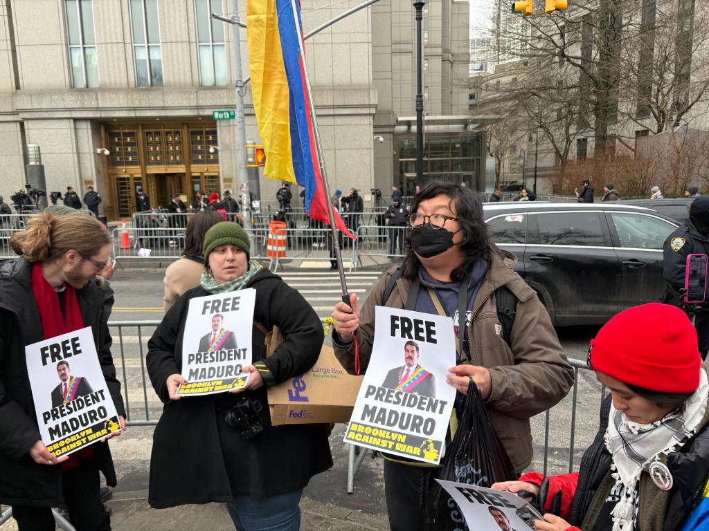 庭内有抗辩,庭外有抗议。美国纽约南区联邦法院外,抗议者聚集,他们高呼口号,举着“释放马杜罗”“不要向委内瑞拉开战”等标语横幅。