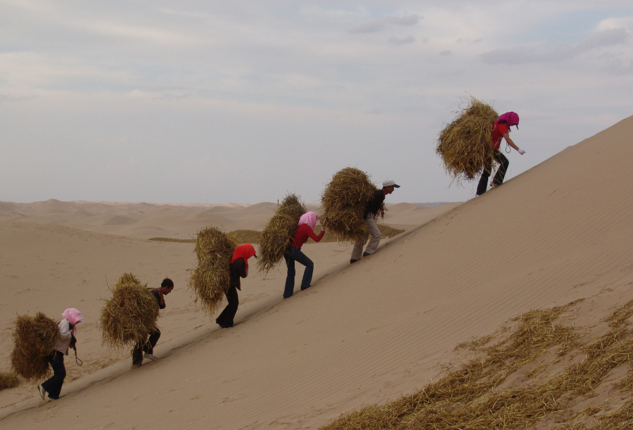 人工将麦草背到治沙现场