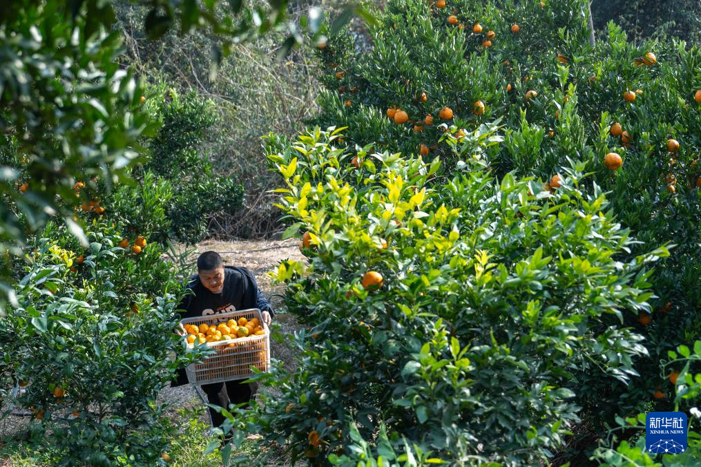 12月11日,在湖北省宜昌市长阳土家族自治县渔峡口镇岩松坪村,村民在搬运刚采摘的清江椪柑。
