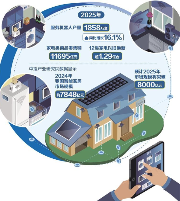 中国是全球最大的机器人市场。中国轻工业联合会会长张崇和介绍,2025年,服务机器人产量达1858万套,同比增长16.1%;养老、清洁、陪护等细分场景产品快速发展。多家大型家电龙头企业率先发力,围绕家庭场景展开服务机器人全方位战略部署,推动家电从单一智能终端向智慧服务载体升级。