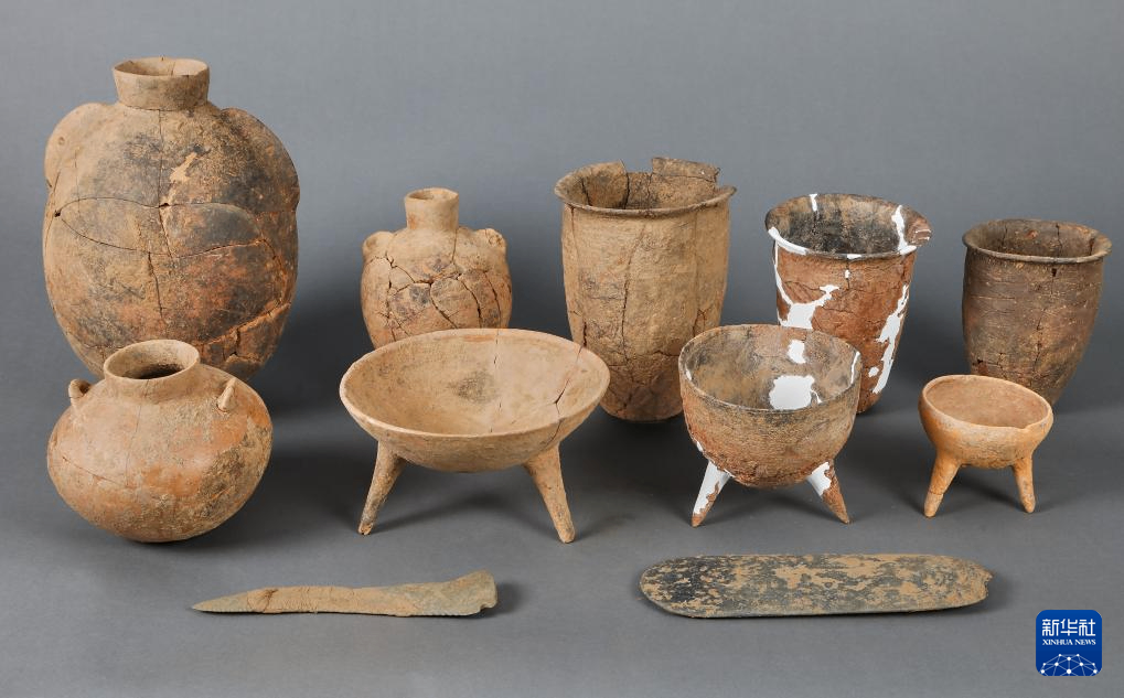 河南新郑市裴李岗石器时代遗址西部墓葬区M85出土的器物组合(资料照片)