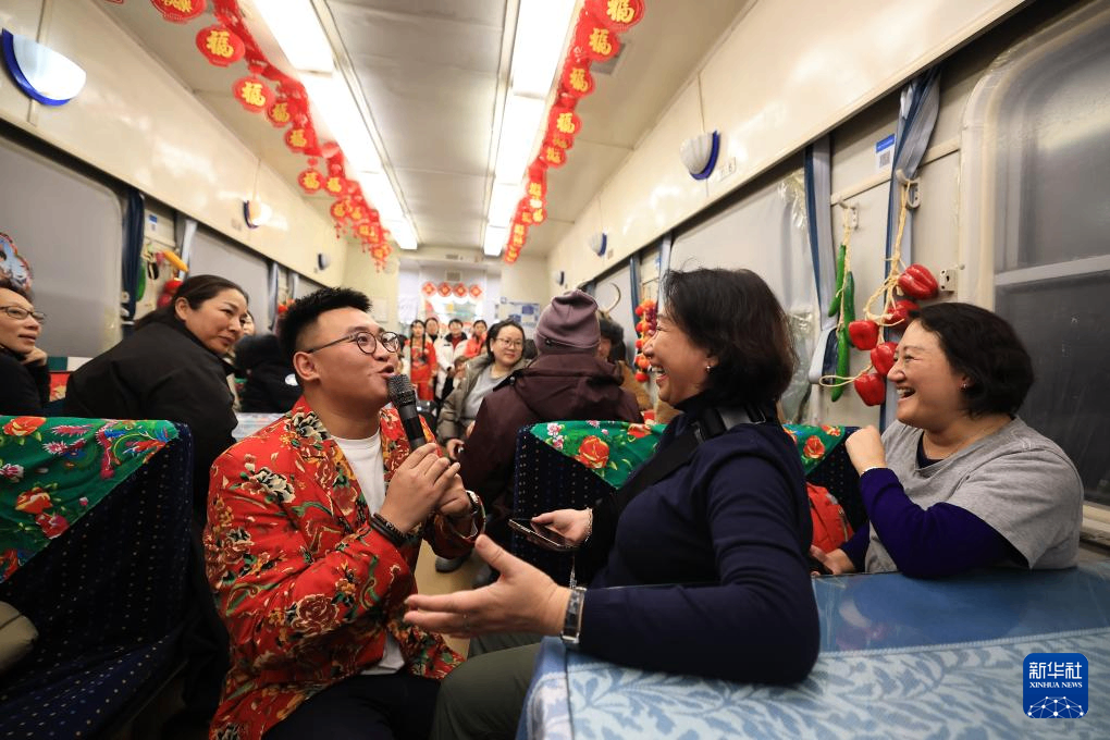 1月19日,来自马来西亚的游客(右二)在K7041次“东北民俗”主题列车上与主持人互动。