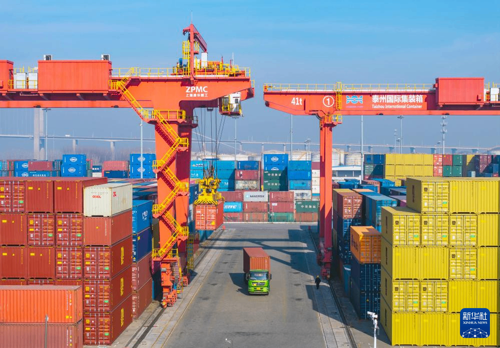 1月14日,运输车辆在江苏泰州港国际集装箱堆场转运集装箱