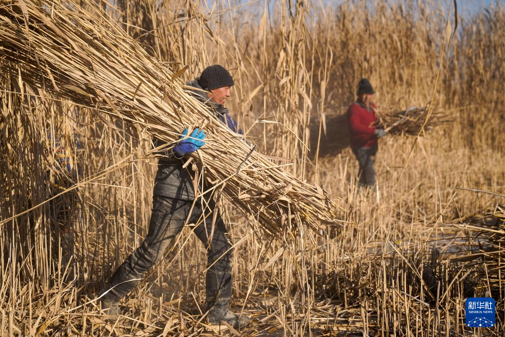 在新疆和田地区墨玉县扎瓦镇,当地农民在收割芦苇(1月10日摄)