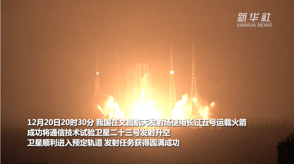 12月20日20时30分,我国在文昌航天发射场使用长征五号运载火箭,成功将通信技术试验卫星二十三号发射升空,卫星顺利进入预定轨道,发射任务获得圆满成功。
