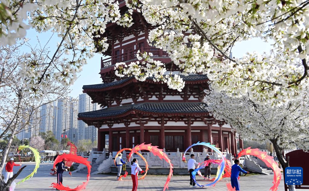 2026年4月4日,游客在河南省洛阳市隋唐城遗址植物园内赏花。