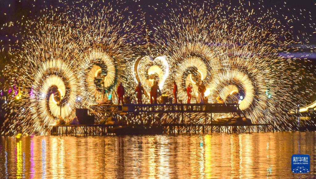 这是2026年2月17日在河南省洛阳市隋唐城遗址植物园“神都上元灯会”上拍摄的水上打铁花表演。