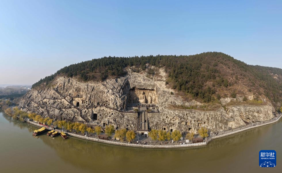 2025年12月5日,游客在河南省洛阳市龙门石窟景区游览(无人机照片)。