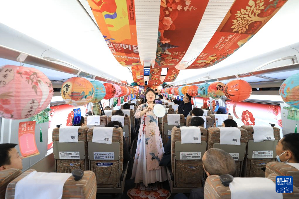 元宵节来临之际,中国铁路哈尔滨局集团有限公司齐齐哈尔客运段担当的齐齐哈尔南开往天津西的G1280次列车上举行“闹元宵·话团圆”主题活动,车厢内张灯结彩,民族歌舞、舞狮、变脸等节目接连上演,让旅途充满节日温情。