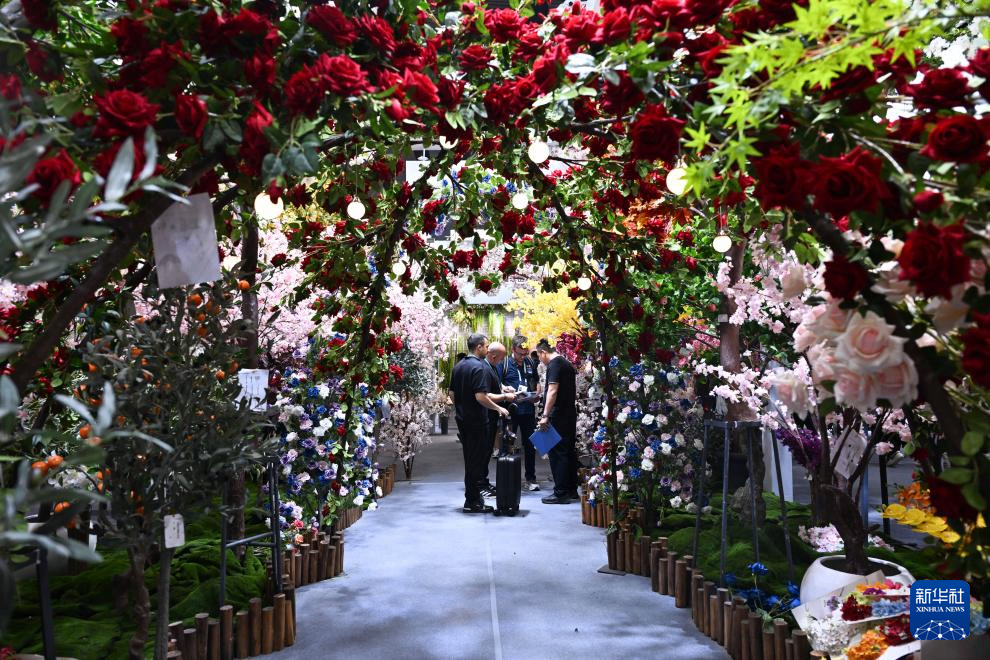 4月23日,境外采购商在第139届广交会第二期的仿真花展台参观。