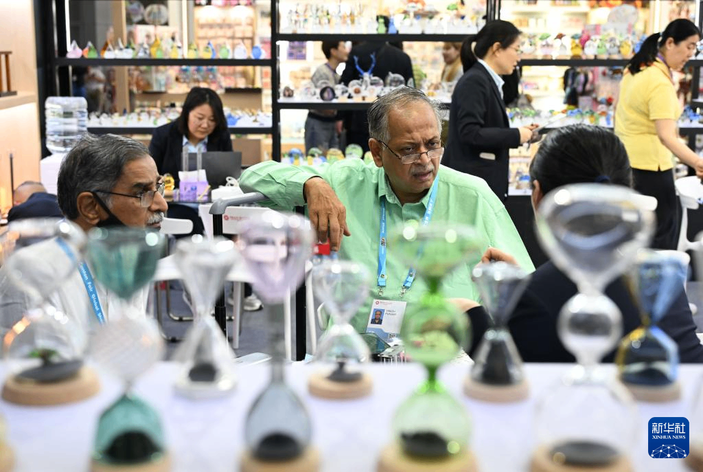 4月23日,境外采购商在第139届广交会第二期的沙漏装饰品展台洽谈。